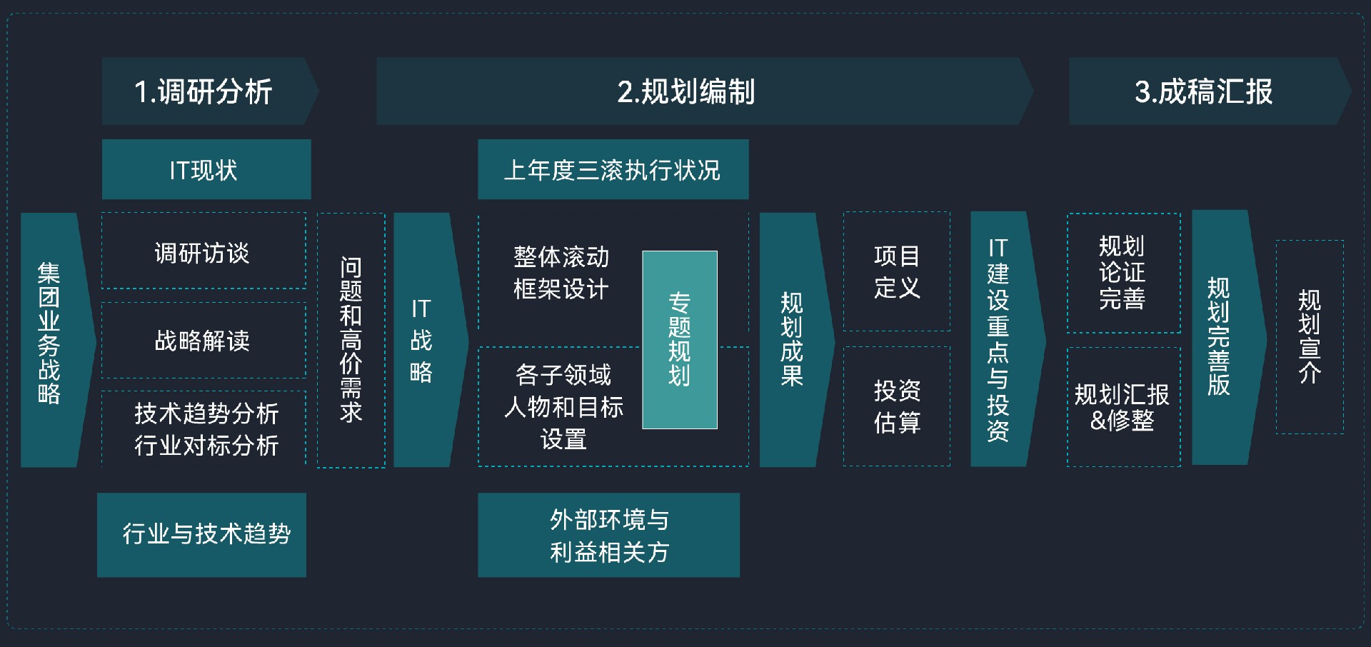 服务以战略与规范要求为指导,结合客户的支撑现状、借鉴先进经验及业内标准,为客户提供专业的规划咨询,帮助客户制定切实可行的IT发展策略和实施方案。